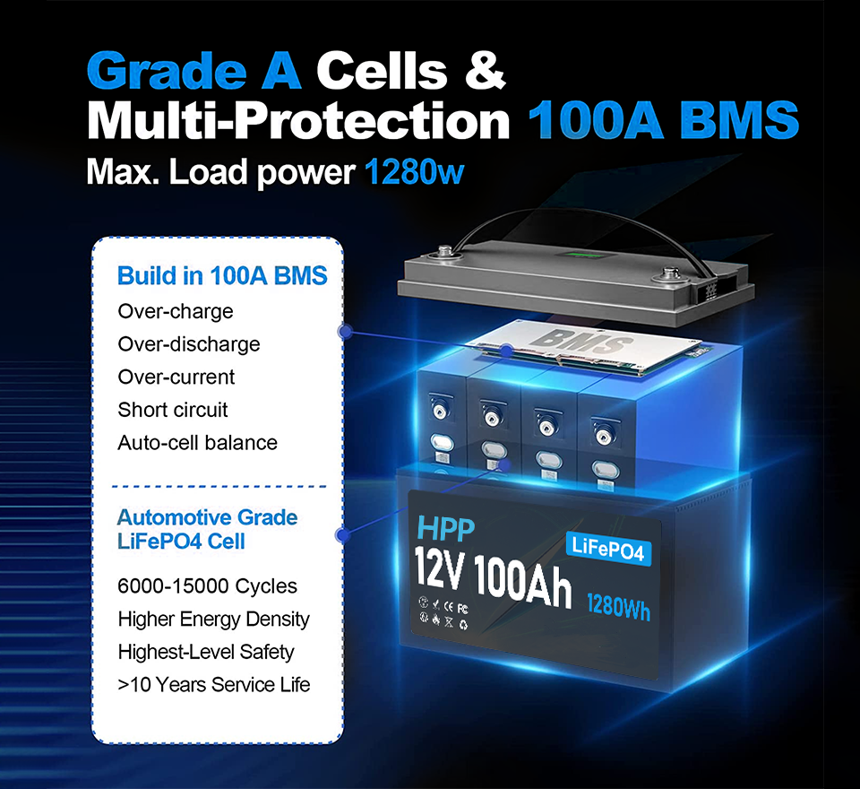 Solar Energy Storage 12.8V 100Ah LiFePO4 Battery Lead Acid Replacement LiFeP04 batteries from HPP are a new generation source of energy storage product. Built-in BMS controls the charging and discharging process, protects the battery against overcharging, deep discharge, overload and overheating,over temperature,over voltage,under voltage etc. Compared to traditional lead-acid technology, including AGM and GEL, 12V/24V series lithium ion batteries produce by HPP are characterized by much greater resistance to deep and frequent discharges.