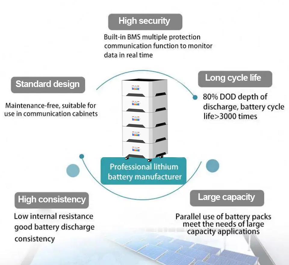 Lithium Iron Phosphate Telecom Battery Module 51.2V low voltage stackable Home Battery,Base Transceiver Station Backup Power lithium battery system is a high-tech product developed by AOGE POWER. As a backup battery for communication equipment, this series has significant advantages such as high power density, small size, long life, high temperature resistance, fast charge and discharge, and modular design.LFP (lithium iron phosphate) cell to ensure the highest safety,high energy density, wide temperature range, longer cycle life.Compact modular design for maximum capacity flexibility, minimize installation time and cost.51.2V LiFePO4 battery system Provides powerful, scalable and long-lasting energy storage for a wide range of residential, commercial and industrial applications.With a modular design, high energy density and robust performance, this system ensures reliable energy supply for your needs in the coming years. Change your energy setup with advanced LiFePO4 technology right now!