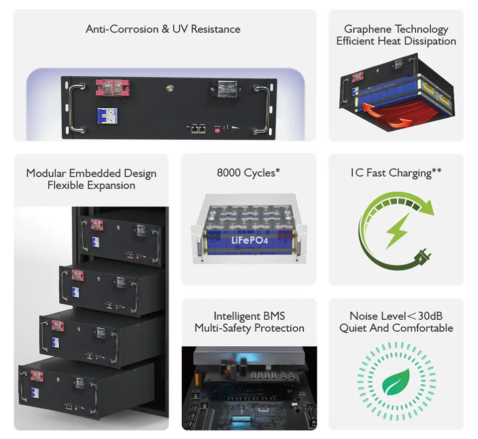 High Energy Density:Compact design with Single Battery with a capacity of 2.56KWh/5.12KWh/7.68KWh/10.24KWh, Multilayer Battery with a capacity of 15.36KWh/20.48KWh/25.6KWh/30.72KWh capacity, featuring a simple appearance and modular structure.High space efficiency, lightweight for easy handling and installation, with flexible configuration options.